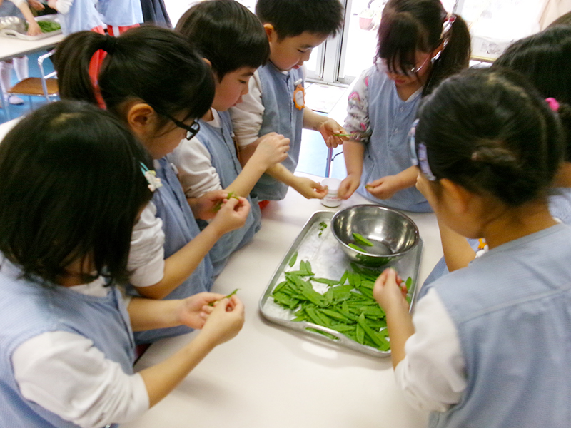 もみじ保育園は、【安心・安全】を食育の第一テーマとして、食材に目を向け、野菜をつくったり、給食食材の玉ネギの皮をとるお手伝いをしたり、給食担当の職員との係わりもたくさんあります。